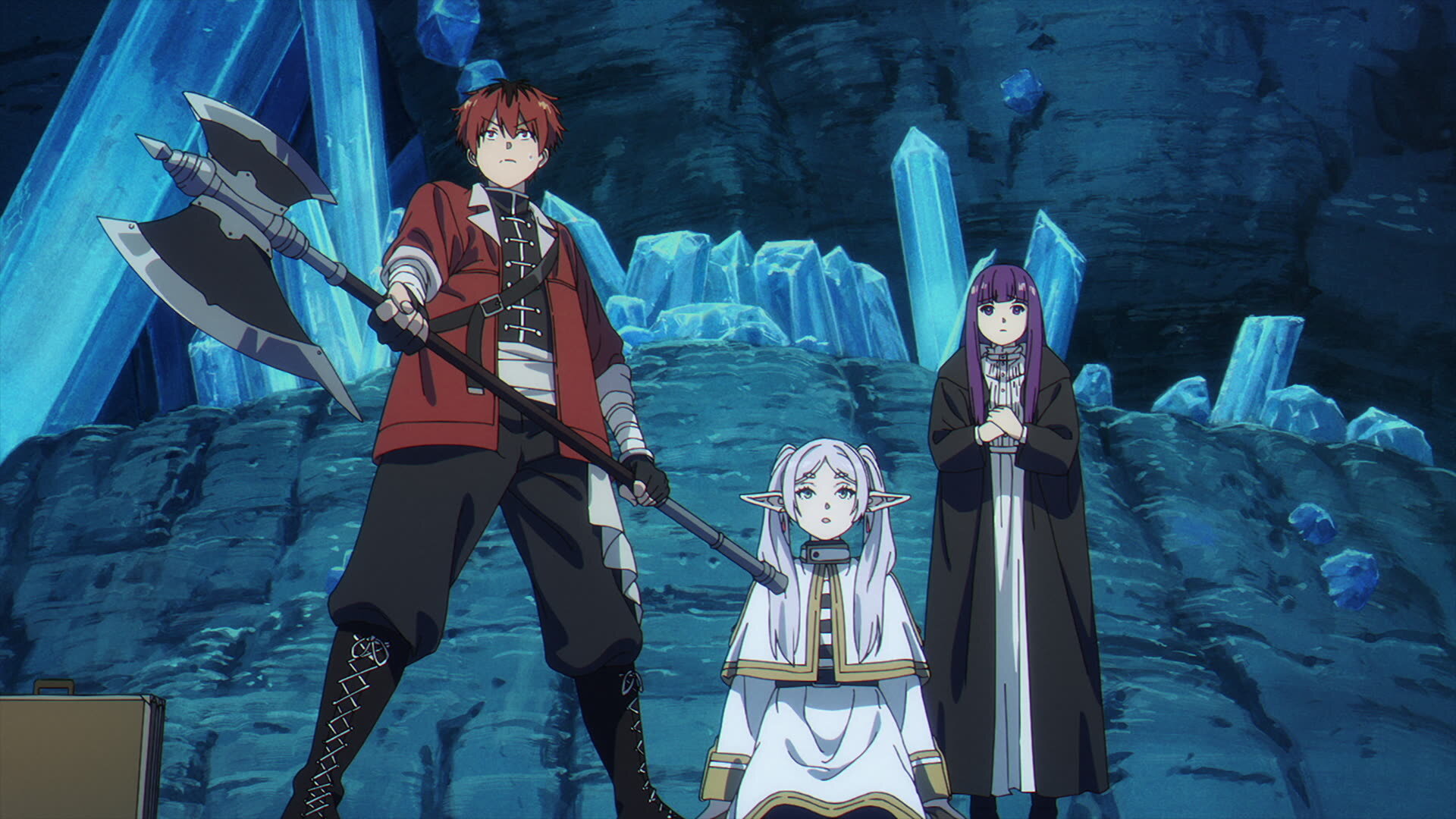 Frieren, Fern, and Stark leave the magic city of Äußerst behind and travel along a road in the northern lands.